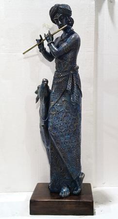 There is a musical rhythm in her work; the flute, the peacock feather, the inward-tilted head, suggesting sound translated into stillness. Unlike heroic monumentality, Shigvan’s sculptures favour intimacy and grace; their elongated proportions and softened gestures evoke bhakti traditions and classical Indian aesthetics without slipping into pastiche. The duality of faces hints at layered identities: inner and outer selves, the temporal and the eternal. Her work draws the viewer into a quiet, sustained communion. In a contemporary moment obsessed with speed, Karuna Shigvan’s sculptures reclaim slowness as a form of reverence.