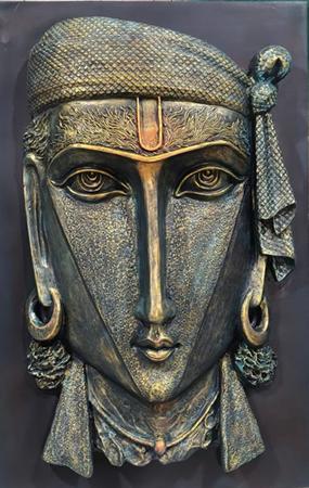Karuna Shigvan’s sculptural language is lyrical, devotional, and inward-looking, shaped by an enduring engagement with feminine presence, musicality, and mythic memory. Her figures, often women, musicians, or dual-faced visages are not portraits in the literal sense but embodiments of states of being: listening, offering, waiting, remembering. Working with bronze and fibreglass, she builds surfaces through intricate texturing that recalls textiles, jewellery, and ritual ornamentation, allowing the skin of the sculpture to carry cultural memory and form.